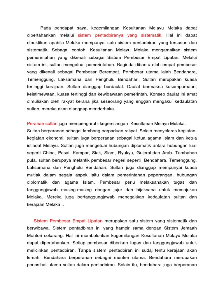 1 Berikut merupakan faktor-faktor kegemilangan Kesultanan Melayu Melaka kecuali a Kepemimpinan Raja b Sistem Pentadbiran c Sistem Perundangan d Sistem Pembesar 2 Bidang kuasa seorang raja ditetapkan mengikut a Hukum Kanun Melaka b Undang-Undang Laut Melaka c Adat istiadat Raja-Raja Melayu d Sistem Pembesar Empat Lipatan 3 Pembesar Empat. KELEMAHAN PEMIMPIN Bendahara Tun Mutahir bersikap pilih. Penubuhan kerajaan Melaka ini telah menjadikan Melaka sebagai sebuah negeri yang maju khususnya pada zaman kegemilangan Kesultanan Melayu Melaka ketika pemerintahan Sultan Mansur Shah pada tahun 1456 hingga 1477.